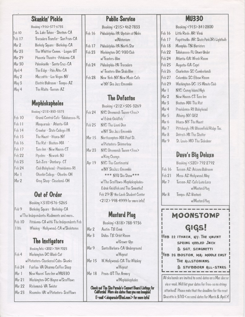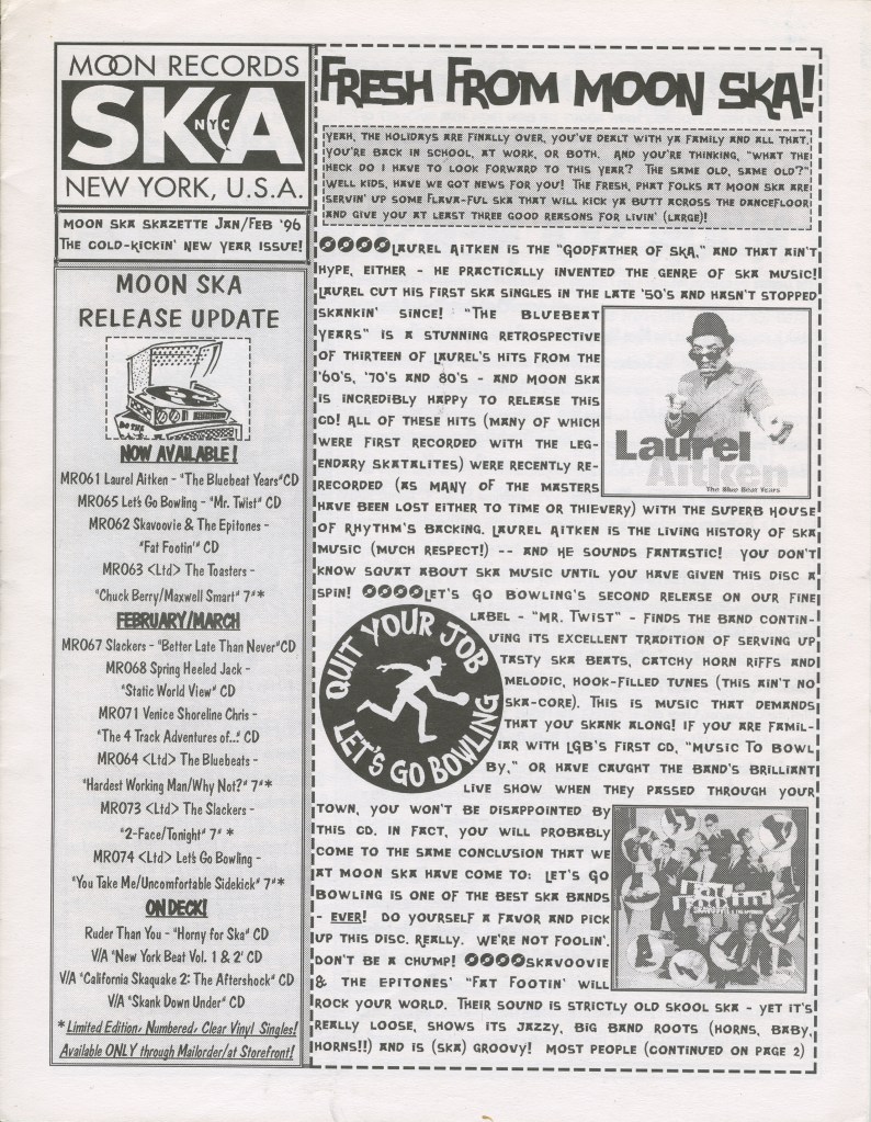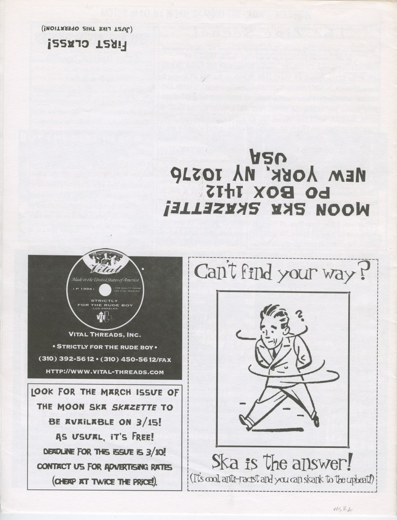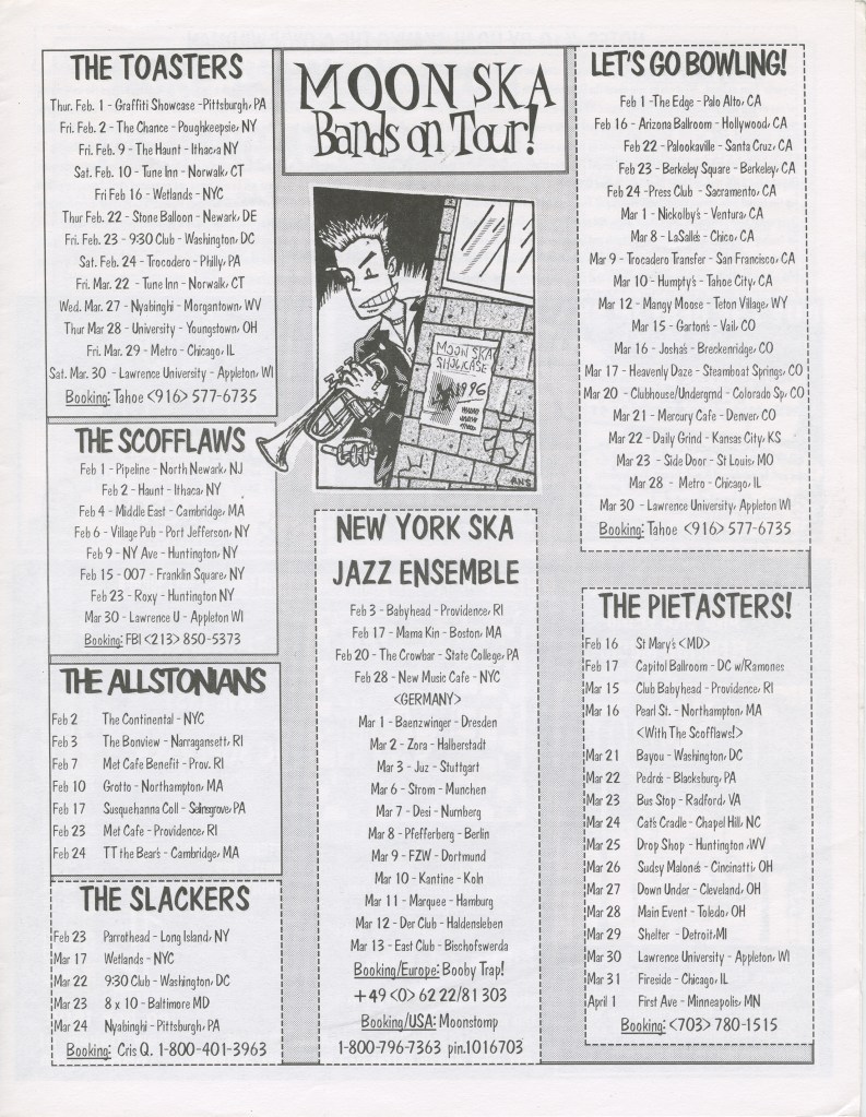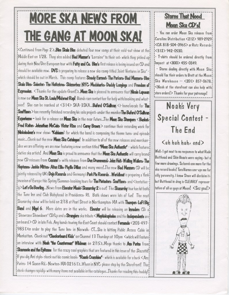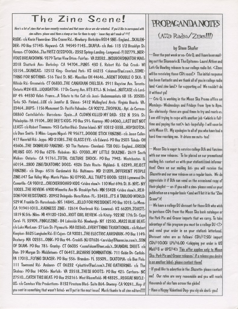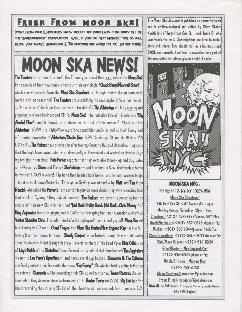 The Moon Ska Skazette is published on a monthly basis and is written designed and edited by Steve Shafer with lots of help from Cris Q. – and Jenny B. who proofreads for me. Subscriptions are free to radio zines and stores fans should mail us a business-sized SASE each month. Feel free to reproduce any part oft this newsletter, but please give us credit. Thanks.