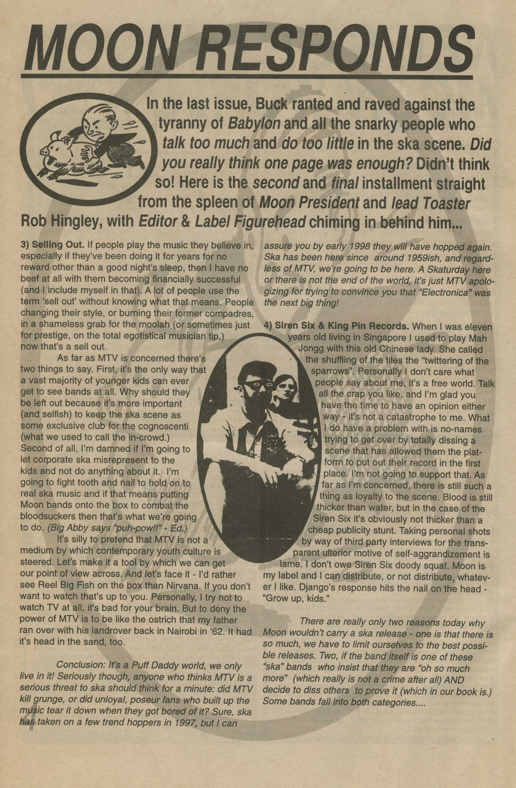 In the last issue, Buck ranted and raved against the tyranny of Babylon and all the snarky people who talk too much and do too little in the ska scene. Did you really think one page was enough? Didn’t think so! Here is the second and final installment straight from the spleen of Moon President and lead Toaster Rob Hingley, with Editor & Label Figurehead chiming in behind him…