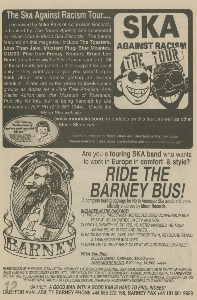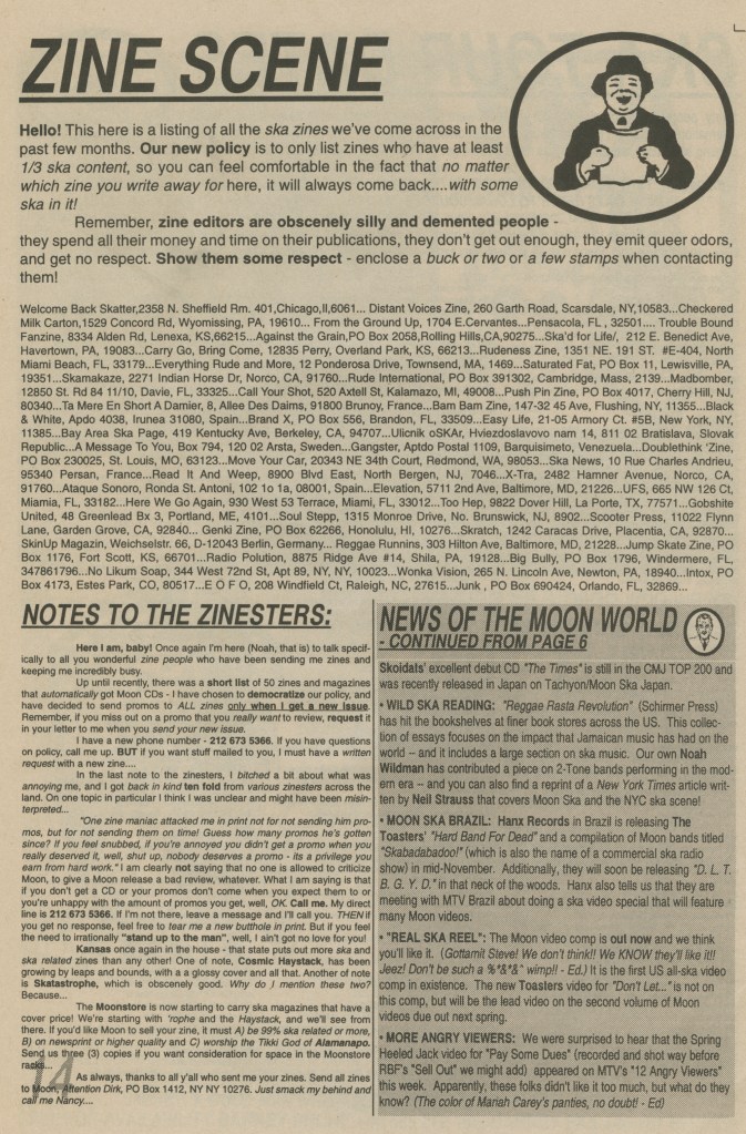 As far as MTV is concerned there’s two things to say. First, it’s the only way that a vast majority of younger kids can ever get to see bands at all. Why should they be left out because it’s more important (and selfish) to keep the ska scene as some exclusive club for the cognoscenti (what we used to call the in-crowd.) Second of all, I’m damned if I’m going to let corporate ska misrepresent to the kids and not do anything about it. I’m going to fight tooth and nail to hold on to real ska music and if that means putting Moon bands onto the box to combat the bloodsuckers then that’s what we’re going to do. (Big Abby says “puh-powl!” – Ed.)