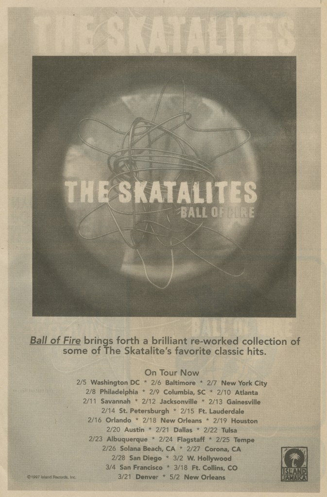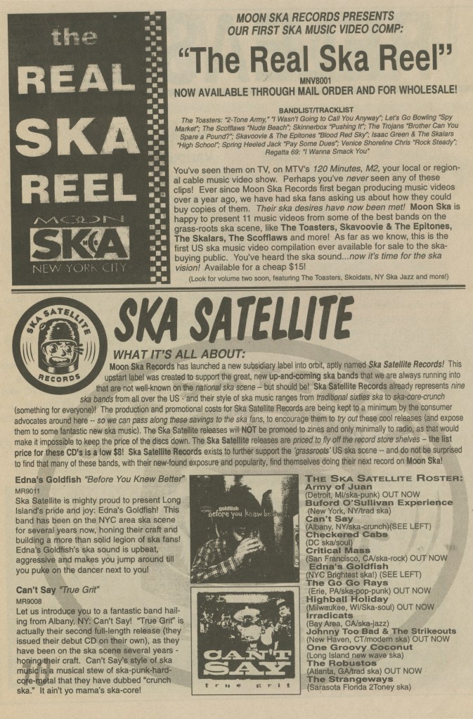 Seriously though, anyone who thinks MTV is a serious threat to ska should think for a minute: did MTV kill grunge, or did unloyal, poseur fans who built up the music tear it down when they got bored of it? Sure, ska has taken on a few trend hoppers in 1997, but I can assure you by early 1998 they will have hopped again. Ska has been here since around 1959ish, and regardless of MTV, we’re going to be here. A Skaturday here or there is not the end of the world, it’s just MTV apologizing for trying to convince you that “Electronica” was the next big thing!