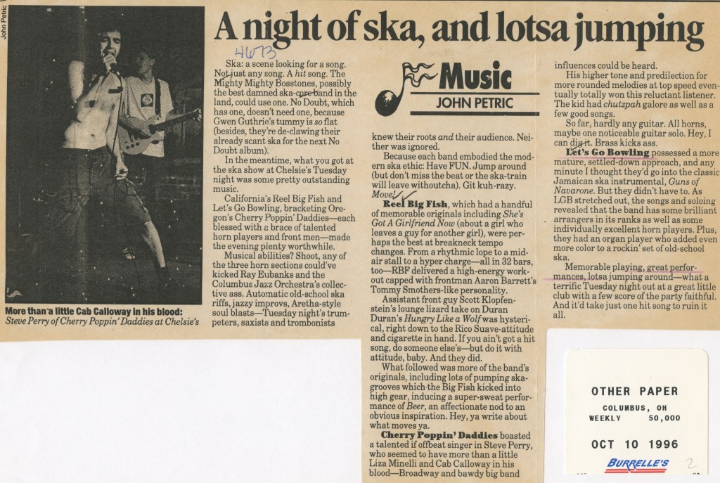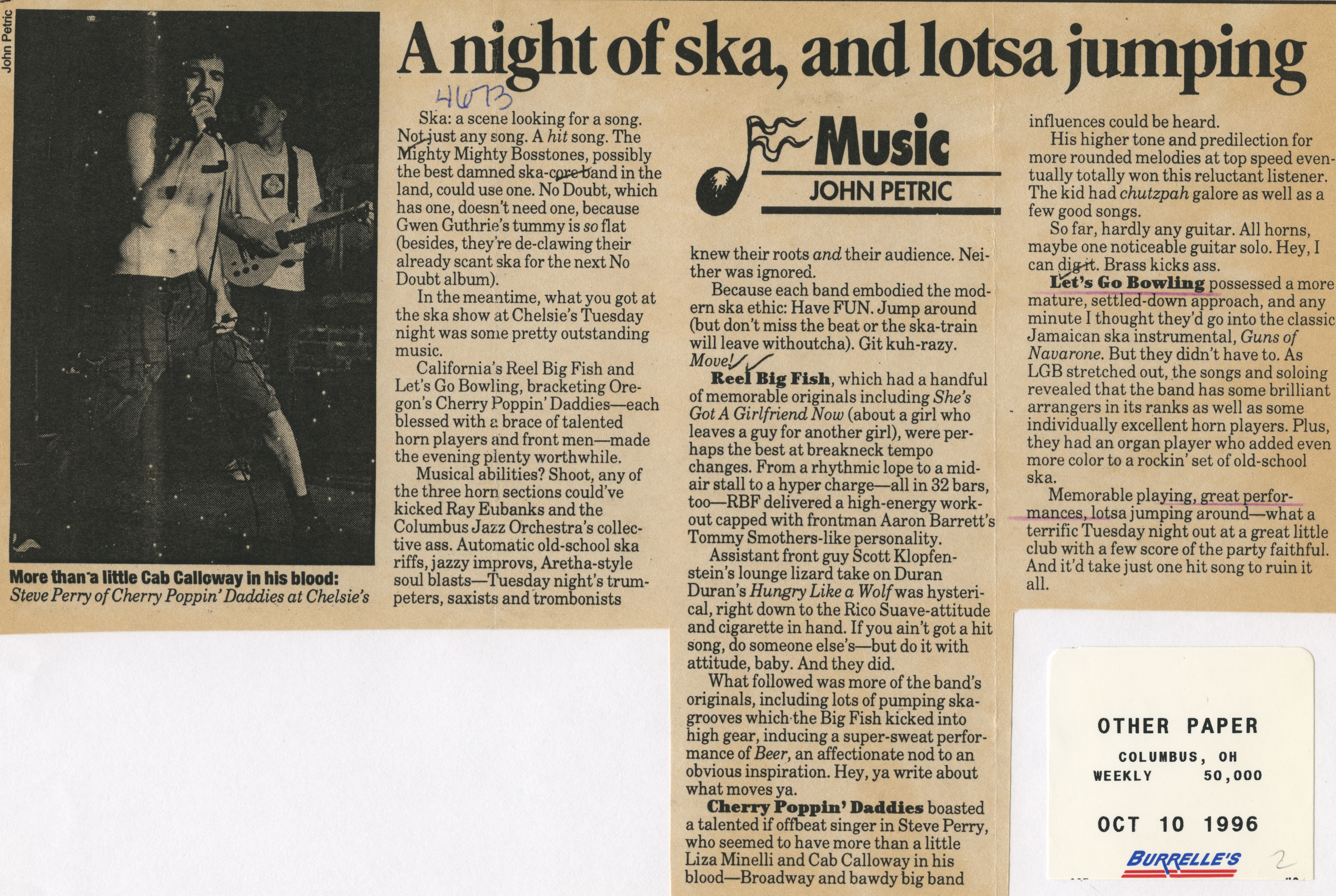 Ska: a scene looking for a song. Not just any song. A hit song. The Mighty Mighty Bosstones, possibly the best damned ska-core band in the land, could use one. No Doubt, which has one, doesn’t need one, because Gwen Guthrie’s tummy is so flat (besides, they’re de-clawing their already scant ska for the next No Doubt album). In the meantime, what you got at the ska show at Chelsie’s Tuesday night was some pretty outstanding music. California’s Reel Big Fish and Let’s Go Bowling, bracketing Oregon’s Cherry Poppin’ Daddies – each blessed with a brace of talented horn players and front men-made the evening plenty worthwhile. Musical abilities? Shoot, any of the three horn sections could’ve kicked Ray Eubanks and the Columbus Jazz Orchestra’s collective ass. Automatic old-school ska riffs, jazzy improvs, Aretha-style soul blasts—Tuesday night’s trumpeters, saxists and trombonists knew their roots and their audience. Neither was ignored.