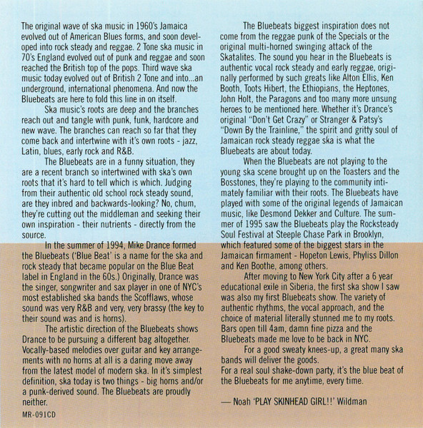In the summer of 1994, Mike Drance formed The Bluebeats (‘Blue Beat is a name for the ska and rock steady that became popular on the Blue Beat label in England in the 60s.) Originally, Drance was the singer, songwriter and sax player in one of NYC’s most established ska bands The Scofflaws, whose sound was very R&B and very, very brassy (the key to their sound was and is horns). The artistic direction of The Bluebeats shows Drance to be pursuing a different bag altogether. Vocally-based melodies over guitar and key arrangements with no horns at all is a daring move away from the latest model of modern ska.